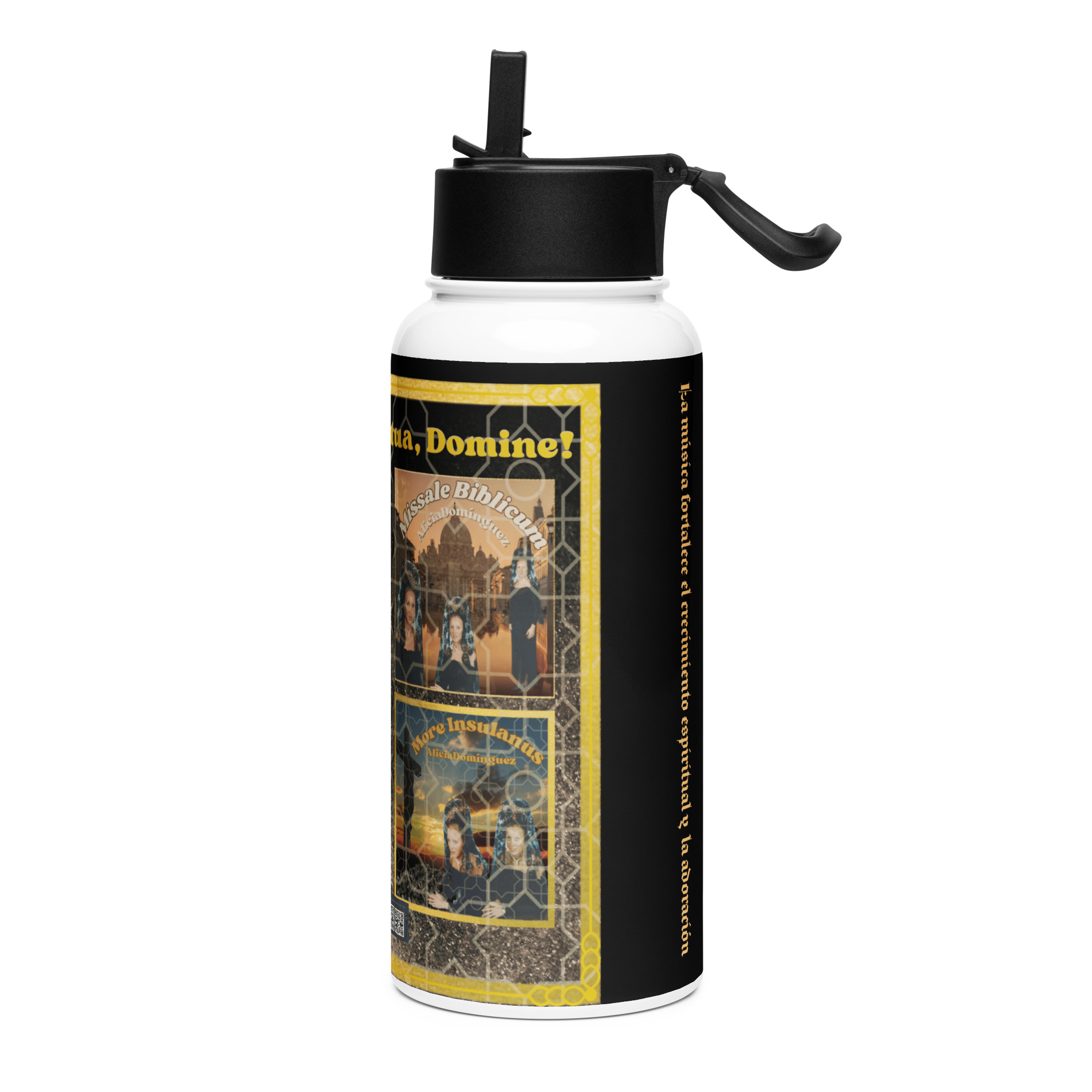 Stay hydrated all day with this 32 oz (950 ml) water bottle. It’s ideal for workouts or busy days, with a wide-mouth foldable straw for spill-free sipping and a rotating handle for easy carrying. With QR codes for the four albums: Sancta Cecilia (Sacred Music), More Insulanes (Procession Marches), Missale Biblicum (Religious Music from the Latin Biblical Missal) and Via Fidei (Chapel Music).